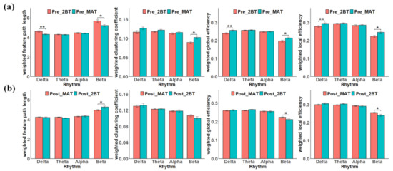 Four network topological features of different rhythms in task switching before and after mental fatigue. (a) for Pre_2BT to Pre_MAT; (b) for Post_MAT to Post_2BT processes. The error bars are the standard deviation divided by the root number 20. * Indicates p < 0.05, ** indicates p < 0.01.