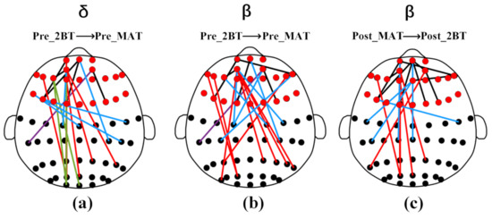 (a,b) are twenty functional connections for delta and beta rhythms during Pre_2BT conversion to Pre_MAT, respectively; (c) is the twenty beta functional connections extracted from Post_MAT transformation to Post_2BT. Frontal lobe leads are marked with red dots. The black edges indicate from the frontal region to the frontal region, the red edges refer to the frontal region to the parietal region, the green edges represent from the frontal region to the occipital region, the blue edges indicate from the frontal region to the central region, and the purple edges refer to the frontal region to the temporal region.