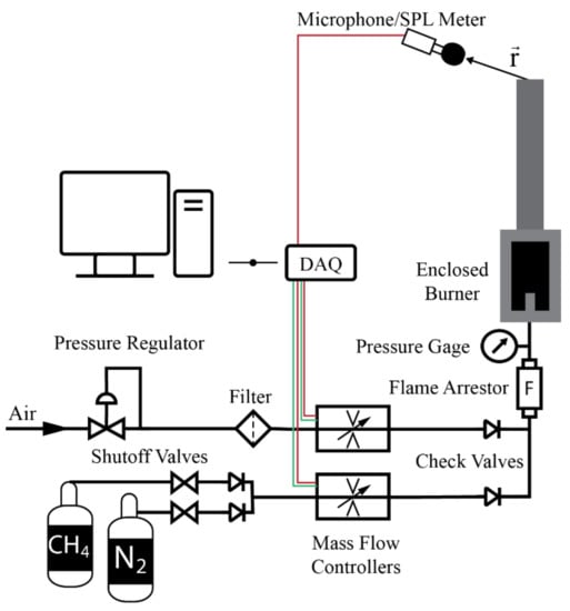 The experimental setup was designed to deliver premixed CH4 and air into a burner (Figure 1) which was placed in confined space. The diagram of the setup is shown in Figure 2, and photographs of the experiment are shown in Figure 3. An external sensor (model UMIK-1 USB measurement-calibrated microphone) and a sound pressure level (SPL) meter (model Larson Davis 831) were placed a distance (3, 3, 6) inches from the center line of the outlet plane. The placement of the sensor can affect the amplitude of the measurements, particularly at the lower frequencies that are produced by combustion. The microphone must be placed in the far-field for its position which is accurately measured to be modeled with the acoustic analogy. The microphone was connected to the computer, and it simultaneously recorded the sound and measured the SPL spectrum using the REW software [17]. The SPL meter recorded the internal memory, then, the recorded data were transferred to the computer.