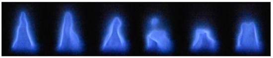The DSLR camera recorded the videos of the flames during the combustion process. Once the flames reached their maximum velocity, the fluctuations and the wrinkling of the flame were observed. The exposure was reduced to capture the flame cone. Still images were taken from the videos to demonstrate the flame wrinkling, and these are placed in Figure 5. The flame wrinkling occurred faster than the camera could capture, so the images do not represent a single period of wrinkling. Additionally, the wrinkling appeared to be unsteady and random rather than periodic in nature like it is expected to be in a tube configuration. The cause of the wrinkling in the flame normally would be attributed to the interaction with the wall and recirculation regions. However, since there was no flow straightener in the device, there was likely influence from the upstream turbulence that was caused by the nozzle being located at the inlet of the burner pipe. This burner inlet was not simulated due to the increased computation cost making it unfeasible with the study’s current resources.