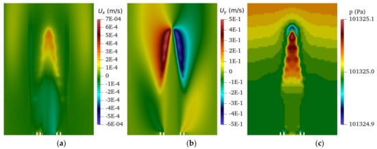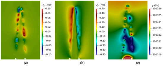 The y–z plane cut of the URANS simulation for (a) x-component velocity, (b) y-component velocity, and (c) pressure.