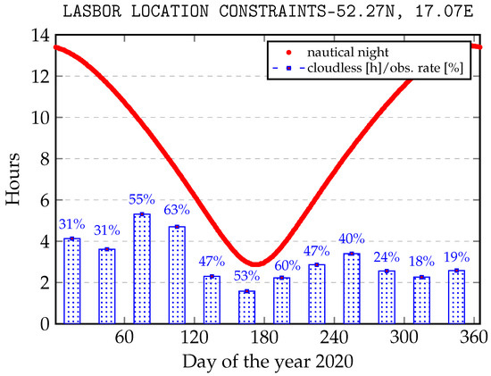 In the present configuration, the SLR LASBOR tracks orbital objects within the nautical night. This implies a variability in the number of daily observing hours over the year. Weather conditions, which strongly depend on the season in Europe, are another aspect. Unfortunately, during the longest nautical nights rainfall and full cloud cover make it difficult to track objects effectively. Figure 6 shows the length of the nautical night over the year and the percentage of weather conditions suitable for tracking operation.