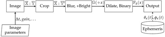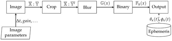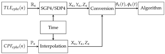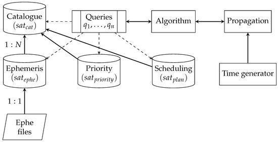 Due to the large number of tracked objects, the catalog of the objects (), ephemeris information (), the acquired measurement data () and other derived data () necessary to carry out the process are stored in the SQL database environment, the processing of which is thus ordered and is carried out in accordance with the following scheme: