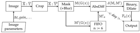The night time processing mode (Figure 10) differs in the way the data are handled. Due to the possible different cloud bases (mainly dependent on the season), and therefore a change in the background constant brightness (light pollution), the night time image analysis is best performed by star detection. The second approach is the differential analysis of consecutive images (Figure 11). Even in the case of full cloud cover, it is possible for the system operator to observe the background changes and estimate the overcast level depending on the wind (cumulative differential image changes).