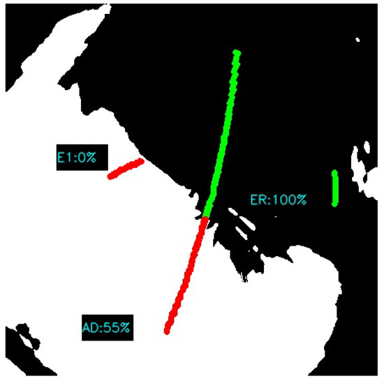 For that moment of time, there were 3 objects from the tracking list (Etalon-1, ERS-1, ADEOS-1) within the measurement range of the SLR station. As shown in Figure 15, the percentage value of visibility for each object in relation to the current cloud cover was estimated (where green markings mean favorable conditions). These values were, respectively: Etalon-1 = 0%, ERS-1 = 100% and ADEOS-1 = 55%. The validity of the estimate depends on the predicted duration of the satellite’s pass in relation to the speed of cloud movement and is only illustrative for the given moment of time.