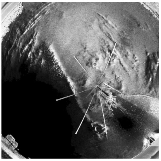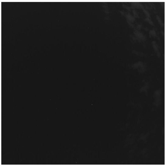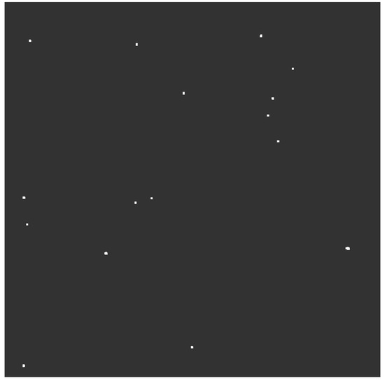 The estimation of the degree of cloud cover in the night mode differs significantly. As described in Section 3.2, the best unequivocal method is star detection. In order to minimize image noise, which can lead to misidentification of the stars, relatively short exposure times were used. This method of acquisition makes it difficult to perform analysis by a human but is not a problem for processing algorithms. Only two brighter stars can be seen on the unprocessed and cropped image shown in the Figure 18, and it would require an operator’s effort to analyze such dark graphic. In accordance with the scheme of operation shown in Figure 10, after the blur operation, the image was brightened (Figure 19), and the stars were highlighted using the dilate process (Figure 20). At this point, the number of visible stars rises to 16 and they are easily seen. The last operation on the image marks the cloudless areas in the form of circles and makes the graphic projection of the trajectories of the object’s passes over the SLR station.