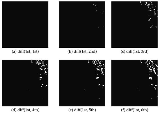 The basis of the algorithm (Figure 11) is image acquisition in every minute and cumulative differential comparison every n minutes (in tests ). Figure 22a–f shows the results of such differential comparisons. The self-differential comparison (a) suppresses the details, which confirms the correct operation of the algorithm. With each successive image (b–f) compared with the base image (1st one), the differences are emphasized. After images is executed, the new base image gets into the FIFO buffer as a reference one. If each captured image was analyzed separately (Figure 23 and Figure 24), it would be difficult or even impossible to determine the cloud cover level in a lit operator’s room. The algorithm shown in Figure 11 highlights any background changes that occur over time (Figure 22b–f), making these changes as white fractions. This way of presenting data does not require increased attention from the station personnel, who can focus on other tasks.
