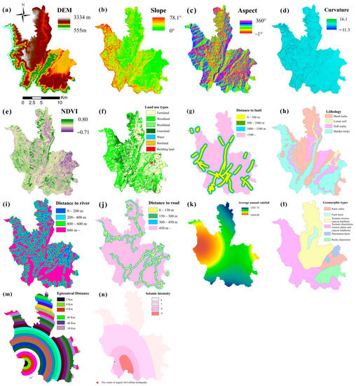 The formation and progression of landslides depend primarily on geological environment conditions and inducing factors. The degree of landslide hazard is closely related to human engineering activities. Ludian county is situated in an active fault zone with frequent earthquakes, making it extremely vulnerable to landslide devastations. Based on previous research, 12 influencing factors, including geological factors, topographic factors, environmental factors, and human engineering activities, were selected [