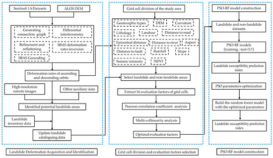 The study of the landslide susceptibility evaluation yielded a large number of successful examples from both domestic and international researchers. However, there are still drawbacks, such as the inability to detect landslide activity, the lack of timely landslide disaster data sources, and the requirement of a large number of experts to participate in statistics. Targeting the issues of slow updates and ineffectiveness of data sources for landslide disasters, in this paper, the SBAS-InSAR technology, a Google satellite image with a resolution of 0.5 m, and other auxiliary data were used to identify landslide disasters in complex mountainous regions with frequent earthquakes, deep valleys, and high topographic elevation. The surface deformation rate was inversed by calculating the phase variation of the ascending and descending orbit radar images. Resultantly, the active situation of landslides and potential landslide hazards could be more accurately identified. The accuracy of the InSAR recognition results could be enhanced by incorporating a Google satellite image with a resolution of 0.5 m and auxiliary data. This paper proposed using a PSO-RF model to predict the susceptibility of landslides in an effort to mitigate the disadvantage of requiring a large number of experts to participate in statistics. During the modeling procedure, the susceptibility index of the grid cells in the study area was predicted by inputting various grid cell learning evaluation factors. This effectively avoided a large number of expert statistics and reduced the manual participation error in the calculations, thereby improving the accuracy of the evaluation model. This paper integrated the SBAS-InSAR technique to obtain the surface deformation rate under different orbit (ascending and descending orbit) operations of the satellite to address the problem that landslide activity cannot be detected. This method was used to identify existing landslides and potential landslides in the study area, thereby increasing the efficacy of the data source for landslide disasters. Due to the relatively high weight of the evaluation factors, some stable landslide points without deformation were prevented from being evaluated as extremely high or high areas.