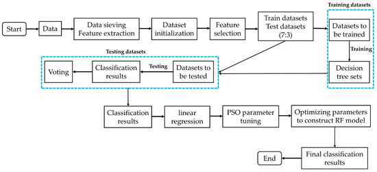 Figure 4 shows the construction process of PSO-RF model in detail, and the whole process can be divided into two parts. The first part is the construction of the RF model by continuously adjusting the number of trees and the number of features in the random forest to obtain the set of triples (number of trees, number of features, and the classification accuracy of the random forest with this parameter). In the second part, PSO is used for parameter optimization. The final classification result is obtained by substituting the optimal parameters into the random model and classifying them again.