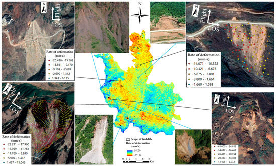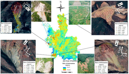 Compared to traditional landslide disaster survey techniques (such as field investigation, GNSS monitoring, etc.), the SBAS-InSAR technology can quickly determine the surface deformation of the study area. The technique identified 97 and 122 potential landslide hazards in the ascending and descending deformation rate field, respectively, updating the existing landslide cataloging data to 329.