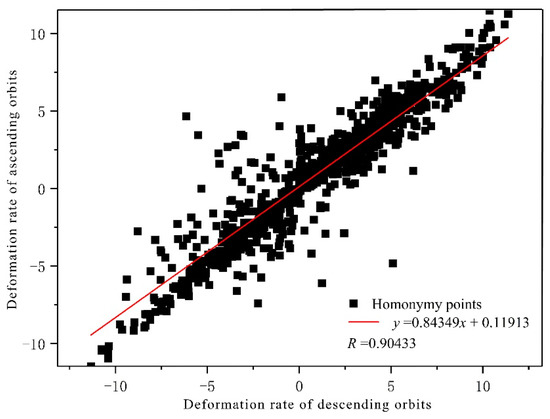 43]. The contribution rate of vertical deformation to the LOS direction of satellite movement is more than 90% regardless of ascending and descending orbits, according to the geometric relationship between radar side-view imaging and the relationship between LOS deformation and surface deformation observed by InSAR [