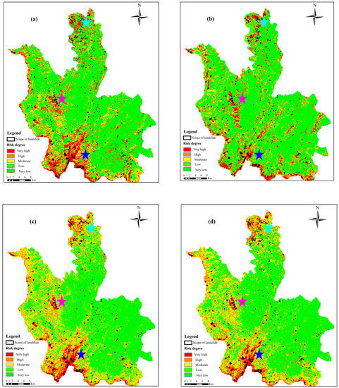 The purpose of accuracy evaluation is to assess the predictive performance of a model. The comparison of the classification results with the actual results served as an example of the model performance (how accurate the prediction is). From a qualitative perspective, the outcomes of landslide susceptibility prediction are shown in