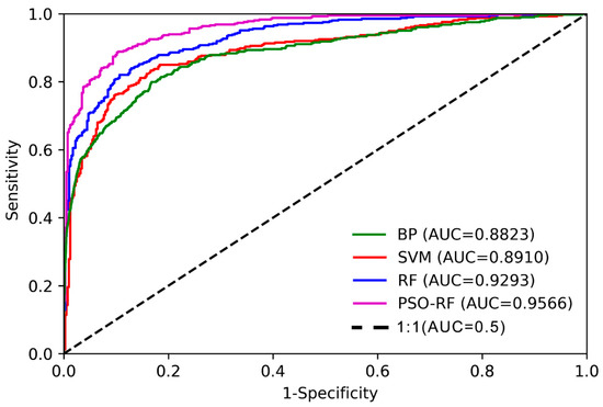 Table 7 displays the results of the calculations, which revealed that the random forest model had the best performance among the single models, with an ACC value of 0.8531, which was 2.57 and 2.20 percentage points higher than BP and SVM, respectively. Using the fast global optimization search function of the PSO algorithm, the particle swarm algorithm optimized the number of decision trees (n_estimators) and the number of random forest features (max_features) to choose the best random forest model. The AUC and ACC values of the PSO-RF model were 0.9567 and 0.8874, outperforming the random forest model by 2.74 and 3.43 percentage points for the same set of input features of the landslide prediction model. The results indicated that the PSO-RF model indicates a near-perfect prediction performance in predicting the landslide susceptibility in complex mountainous regions and was more applicable to the evaluation of landslide susceptibility prediction in this study area than the other three models.