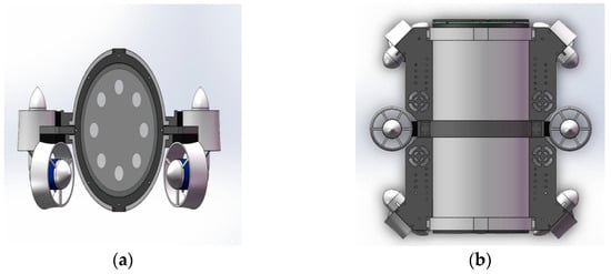 CAD model of UUV with six thrusters. (a) Front view. (b) Top view.