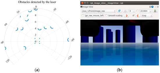 To sense the environment and measure the attitude, position, and velocity of the UUV in the simulation, corresponding sensors need to be established to simulate various required signals. Open-source sensor models or self-designed models can be used as Gazebo plugins to connect to the UUV model, and the sensors (underwater camera, inertial measurement unit, laser, sonar sensor, ground truth plugin, etc.) already carried by this simulation platform are derived from the UUV simulator [] and hector quadrotor [] (an open-source UAV simulation platform under ROS). For example, the sensor images of the laser and underwater camera used in this work are shown in Figure 4. In addition, all sensors share a common error model: