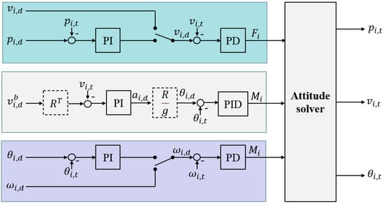 We extend the control plugins in [] based on the above dynamic model, and its control logic is shown in Figure 5. There are three control loops that control the linear velocity, attitude, and angular velocity of the UUV, respectively. The control quantity is converted into the force or torque of the corresponding axis through the cascaded PI, PD, or PID controllers, and finally output to the attitude solver. The variables, p, v, a, θ, and ω, respectively, represent position, linear velocity, acceleration, angle, and angular velocity, while the subscript i can be one of the three coordinate axes, X, Y, and Z; the subscript d is the expected quantity, meanwhile, the subscript t is the real quantity.