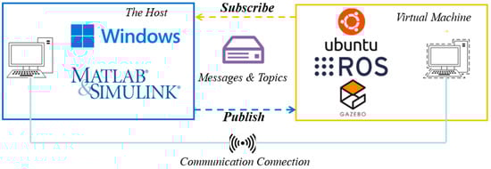 The schematic diagram of the co-simulation based on Matlab and ROS is shown in Figure 6, with Matlab/Simulink as the control terminal and ROS/Gazebo as the controlled terminal. The controlled terminal handles the physics of the rigid body (UUV), while the attached plugins are responsible for sensor reading and motion controlling. After establishing communication, the control terminal can perform high-level planning (see Figure 7 for details) based on images and sensor data acquired from virtual sensors, which is done by subscribing to the corresponding topics and publishing commands. In principle, the control terminal and the controlled terminal need to be distributed on different devices. However, a virtual machine can be created as another device, and this approach is adopted in this study. The Matlab version of the control terminal is R2021b under the Windows operating system, and the ROS version of the controlled is Kinetic under the Ubuntu 16.04 operating system.
