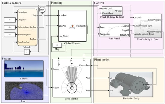 In Figure 7, a comprehensive, high-level planning template is created in which the task scheduler based on Stateflow is responsible for transforming complex tasks into a series of events triggered by temporal conditions or external input signals. Then, the plan module is responsible for planning a collision-free path according to the starting and ending positions output by the task scheduler. The plan module contains the global planner and the local planner, which can be used separately or jointly according to the requirements, and it is worth mentioning that the binary raster map of the simulation scene should be received through the map before planning. The global planner uses the A-star algorithm to output a set of waypoints for the control module, and the control module uses the pure pursuit algorithm to calculate the expected velocity and angular velocity and publish them to the velocity topic in the plant model. The local planner mainly uses the vector field histogram (VFH) algorithm and adjusts the velocity by combining the expected linear velocity and angular velocity calculated by the control module with the scanning information of the laser in the sensor module to avoid the obstacles in the environment while executing the path following task. The plant model can also subscribe to the position and attitude information of the UUV in ROS/Gazebo, and the camera and laser included in the sensor module support the visual display. In addition, the template is modular, allowing users to design autonomous scheduling schemes, planning algorithms, etc. for testing and performance evaluation.