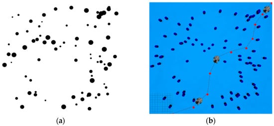 Subsequently, we simulated the path-planning task, and the simulation scenario in Figure 8 is a 50 m × 50 m water area with obstacles; each obstacle is higher than the UUV and on the same plane. The specific task is to conduct global path planning by the A-star algorithm and local obstacle avoidance by the VFH algorithm to control the UUV moving from position (0,0) to position (50,50).