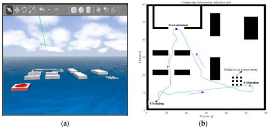 The simulation results of scheduling task. (a) Simulation scenario for task scheduling. (b) The trajectory of the UUV in the simulation platform.