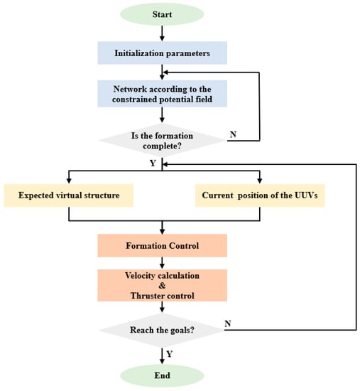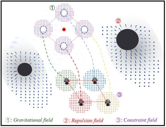 The schematic diagram of the formation control scheme based on the improved artificial potential field and the virtual structure is shown in Figure 11. Firstly, the virtual structure (reference points) is set around the target, and then, the UUV moves towards the reference points under the action of gravitational potential. Under the action of the communication-constrained potential field, the UUVs will dynamically adjust the approaching speed by considering the distance difference between other UUVs and the reference points to prevent a certain UUV from moving too fast or too slow to achieve stable formation.