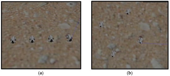 The formation control scheme based on the improved artificial potential field and virtual structure is proposed in the previous section. To verify the feasibility of the scheme, the target-hunting experiment is designed and simulated in the simulation platform. The size of the experimental field is set as 10 m × 10 m, and the number of UUVs participating in the target hunting is set as 4, and the target is set at point (5,8). Gaussian noise is added to simulate the interference of the underwater environment when obtaining the real-time position of the UUV; the details are in Equation (10). In the following simulation experiments, UUVs are arranged as “line” and “diamond” formations to hunt the target respectively, and the simulation process is shown in Figure 12.