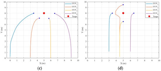 For the “line” formation target-hunting experiment, the initial positions of the UUVs are set at points (0,0), (3,0), (6,0), and (9,0). For the “diamond” formation target-hunting experiment, the initial positions of the UUVs are set at points (4.5,2), (3,1), (6,1), and (4.5,0). The running results of the simulation platform are shown in Figure 13a,b, and the historical paths of the four UUVs are shown in Figure 13c,d, respectively. As it can be seen from Figure 13, when the UUVs approach the target, they can maintain the formation while moving towards the target, ensuring the spacing with the target and the friendly UUVs, and finally surround the target, which means that the hunting is successful.