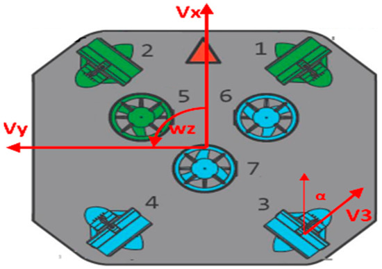In terms of power, the mobile carrier of the UUV is mainly composed of seven thrusters, two upper and lower support plates, and four electrode plates. The distribution of the thrusters is shown in Figure 15. The thrusters numbered 1–4 are used to control the movement of the UUV on the horizontal plane, and the adjacent two thrusters are arranged at 90°. The remaining three propellers are used for the UUV ascending and descending motion, which are arranged in an angle between the hull, and the coordinated operation of the seven propellers can help the UUV achieve omnidirectional motion. Firstly, the control module will calculate the movement speed (Vx,Vy,Wz) required by the UUV through PID and then adjust the speed of each thruster according to the power distribution scheme. Taking the thruster 3 in the horizontal direction as an example, when the thruster rotates to the forward direction, it will provide the UUV with a velocity of V3 at an angle, α, to the Y-axis, and the velocity can be decomposed into: