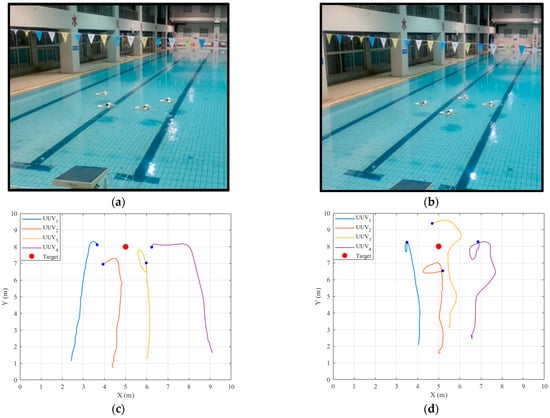 The results of the underwater experiment. (a,b) The running results of two experiments in the pool. (c,d) The UUV trajectories of the two experiments.