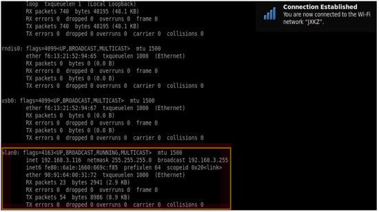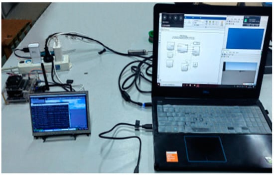 The setup of our hardware-in-loop simulation system is shown in Figure 17; the slave machine on the left is connected with a display screen, and the master machine is on the right. The master and slave computers communicate with each other through the wireless interface, wlan0; the network connection status is shown in Figure 18.