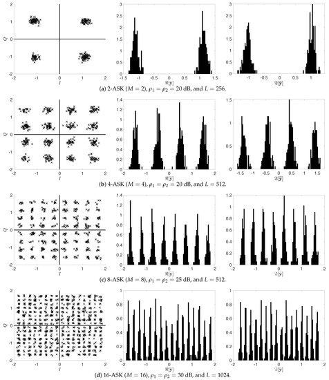 The constellation diagrams of (first column), in-phase axis energy histograms (second column), and quadrature axis energy histograms (third column), for , respectively, where , , and . For each case, the system SNR and frame length L were set appropriately to clearly present the characteristics.
