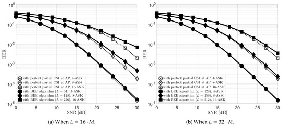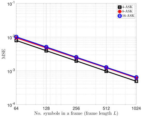 Figure 3 shows the BER performance of the proposed uplink STLC-NOMA system with the BEE scheme designed in Section 4. Here, 2-ASK is omitted because even the channel gain is not required in this case like the PSK constellation diagram. Specifically, as shown in the first column in Figure 1a, the AP can detect the signals transmitted from STAs by distinguishing only the quadrant. The transmit powers and large-scale fading components of both STAs are still set to and , respectively. For the BEE algorithm, the maximum number of iterations of the EM loop was set to 100, and . Moreover, we set the frame length of each STA to in Figure 3a and in Figure 3b, according to the modulation order M. We can observe from Figure 3 that since the accuracy of the clustering method depends on the number of available data points (the number of symbols in a frame), as shown in Figure 4, the longer the frame length, the better the BER performance. For example, with an SNR of 30 dB and modulation orders of 8 and 16, the BER performance is improved by almost 50% when compared to when . On the other hand, the proposed BEE algorithm has a trade-off between accuracy and frame length. Specifically, the BEE algorithm has computational complexity depending on the frame length L and modulation order M; hence the complexity linearly increases as the frame length increases. Figure 4 depicts the average mean squared error (MSE) of the estimated energies for both STAs, defined as , when the transmit SNRs of the two STAs are 30 dB, i.e., dB. We can observe that the MSE of the BEE algorithm has linearly improved with respect to the frame length in the log-log domain. As earlier mentioned, the more symbols within a frame, the more observations available at the AP, resulting in the MSE improvement. Figure 3 and Figure 4 also show that the designed BEE scheme works well enough for short-length frames.