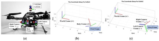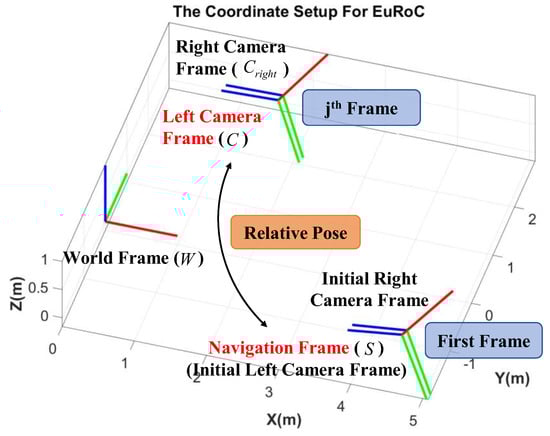 EuRoC [] dataset is used for the final algorithm validation. The euRoC dataset not only provides stereo image sequences and IMU measurements but also the relative pose relationships between sensors and the ground truth about 6 degrees of freedom (DoF) pose, which will be used as a reference in this paper. More details about this dataset can be accessed in the “Data Availability Statement” section at the end of this paper. In order to facilitate the comparison of results, this paper refers to its coordinate settings. The whole coordinates system contains a left camera frame (), right camera frame (), body frame (), world frame (), and navigation frame (). Both camera frames take the front shooting direction as the z-axis, while the right and bottom of the shooting direction as the x-axis and y-axis, respectively. The optical center of the camera is taken as the origin. The body frame is the same as the z-axis parallel to the front shooting direction but different from the camera frames; the upper and right sides of the shooting direction are the x-axis and the y-axis. The world frame whose z-axis is parallel to gravity is defined by instruments that provide ground truth poses, such as the Vicon tracking system or Leica MS50. In order to show the definition of all frames more clearly, Figure 1 is provided to help to understand.