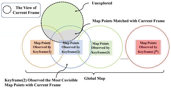 The current tracking frame is treated as a keyframe as long as it meets the keyframe selection criteria. It is worth mentioning that the core strategy of keyframe selection is to check whether the whole map can provide enough feature points for the current tracking frame to match. S-PTAM in [] selects the keyframe that has the most covisible points with the current tracking frame and then takes the number of map points observed by this keyframe as the reference. When the number of map points matched with the current tracking frame is less than half of the reference or less than twenty, the tracking frame is considered a keyframe. In short, the keyframe observes more places that have not been explored before, as shown in Figure 3.