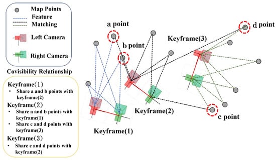 S-PTAM [] will use the feature matching information between keyframes and map points to maintain a covisibility relationship to manage the situation that each map point observed by multiple keyframes, as shown in Figure 4.