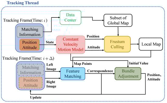 By searching for keyframes that have a covisibility relationship with the previous tracking frame, the map points that may be observed at that moment can be quickly predicted from the global map, namely the submap. Then, the initial guess of the left camera pose can be predicted by the constant velocity motion model, which can combine with frustum culling to further remove the map points that cannot be seen in the submap, and further obtain the local map. Thereafter, matching features between the stereo image at the moment and the local map are conducted. Finally, according to the matching result, BA is applied to obtain the optimal pose, which takes the output of the constant velocity motion model as the initial guess. The overall tracking thread is to repeat the above steps continuously. The associated detailed flowchart is summarized in Figure 5.
