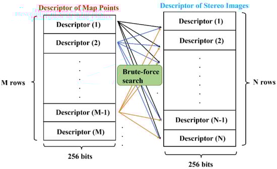 The BRIEF descriptor is a 256-bit binary vector, therefore, the Hamming distance is adopted to evaluate the feature similarity. For example, if there are two binary vectors, such as 10001 and 01011, with three different bits in the same position between them, then the Hamming distance is defined as three. As a result, the larger the Hamming distance, the lower the similarity of the two vectors. Following the above description, in this paper, each 3D map point on the local map is checked against all the feature points on the current stereo images by the brute-force feature matching algorithm, further matching those with the minimum Hamming distance and below the matching threshold. The illustration of the overall matching algorithm is shown in Figure 7, while Figure 8 shows the result of feature matching in the EuRoC dataset. At the same time, since stereo rectification is performed in advance, the ideal matching pairs can be guaranteed to have close values, which can be used as a physical constraint to preliminarily filter out the extreme outliers. However, as illustrated in Figure 8, although this strong matching constraint can remove most of the outliers, certain mismatching pairs remain inevitable, as shown by the pink lines in Figure 8. Therefore, the BA algorithm, which is susceptible to mismatching, must introduce an additional mechanism to maintain the pose estimation accuracy. The related details will be presented in the next section.
