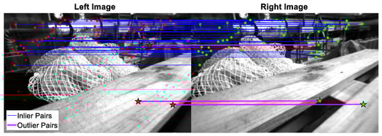 The result of feature matching pairs in the EuRoC dataset. (The left and right image represent the images from the left and right camera of the stereo camera, respectively.)