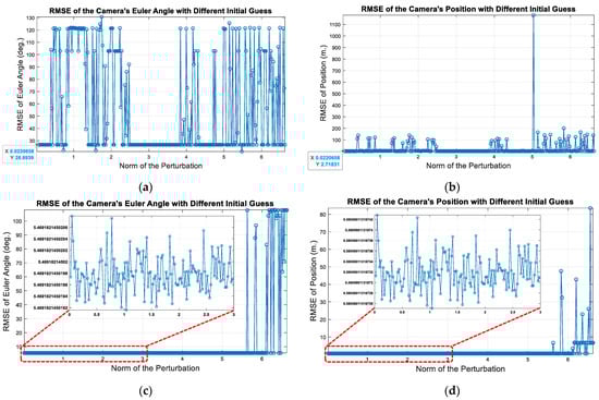 Optimization results of motion-only BA according to different initial guesses: (a) RMSE of Euler angle (without using Huber); (b) RMSE of position (without using Huber); (c) RMSE of Euler angle (with using Huber); (d) RMSE of position (with using Huber).