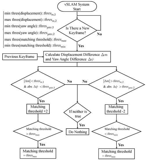 Although vSLAM is capable of achieving effective exploration in a GPS-denied environment, the associated algorithms involve a considerable number of parameters or thresholds. In general, these parameters are not only fixed after system startup but also mostly lack intuitive physical meaning, making it difficult to have a well-founded manual adjustment. For UAVs with aggressive motions or in complex operating environments, these parameters require instant online updates to keep the system in optimal condition. For the above reasons, the concept of dynamic threshold is introduced into the field of vSLAM, such as dynamically adjusting threshold value [], which controls the selection of keyframe based on field-of-view (FoV) repetition rate. Meanwhile, according to the results of several experiments, it is found that the selection of feature matching threshold has a dominant effect on positioning accuracy. Therefore, how to effectively select the matching threshold online according to different situations will be one of the key discussion issues in this paper.