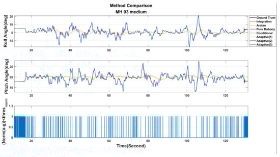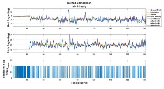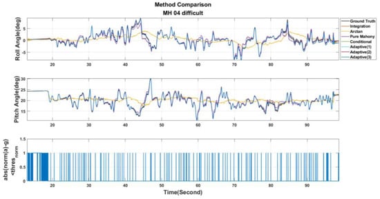 According to Table 7, Case. A, the original vSLAM system, is unable to perform localization successfully without using both the proposed online adaptive algorithm and the motion compensation loop subroutine. In addition, in Case B, even though the system can work properly in MH_01_easy, MH_02_easy and MH_05_difficult series, the UAVs’ localizations still fail for MH_03_medium and MH_04_difficult series. On the contrary, by using the proposed online adaptive algorithm and the motion compensation loop subroutine, namely Case. C, not only the pose estimation can be successfully conducted in all data series, but also the localization accuracy can be maintained. The above experimental results firmly reveal that the developed motion compensation loop subroutine can indeed increase the robustness against shading by the addition of IMU information, and more importantly, a better level of robustness performance will be achieved by further combining online adaptive parameter tuning algorithms. The key factor is that the online adaptive parameter tuning algorithm can effectively increase the attitude estimation accuracy, thereby improving the motion compensation quality, which heavily relies on the estimated free acceleration and attitude shown in Equation (61).