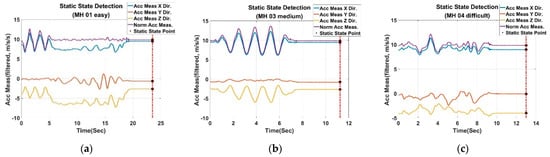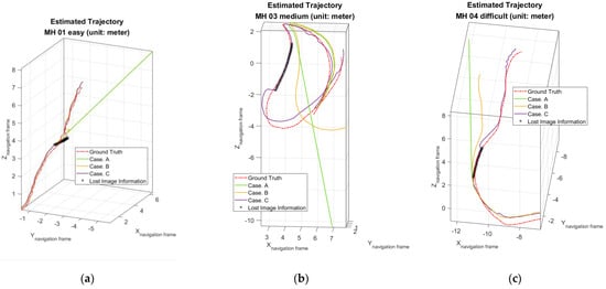 Estimated trajectories in anti−shading robustness test: (a) For MH_01_easy series; (b) For MH_03_medium series; (c) For MH_04_difficult series.