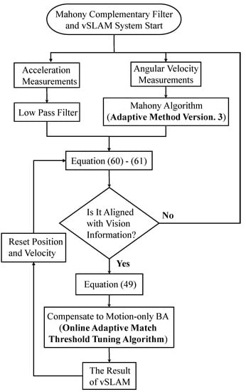 In fact, not only the vSLAM system has the requirement of online parameter adjustment, but also the Mahony complementary filter [] for UAVs attitude estimations. As the UAVs are under aggressive motions, the measured acceleration varies drastically, which will cause biased attitude estimation. The biased estimates not only deteriorate the basic flight stability of UAVs, but also lower the vSLAM accuracy. Therefore, this paper proposes to adjust the online in Mahony complementary filter to further improve the attitude estimation accuracy, not only to achieve better flight performance of UAVs, but also to prepare for the information fusion with the vSLAM system. The following summarizes the three major problems that are going to be addressed in this paper:
