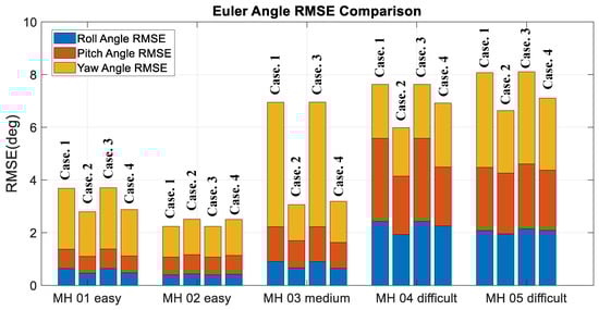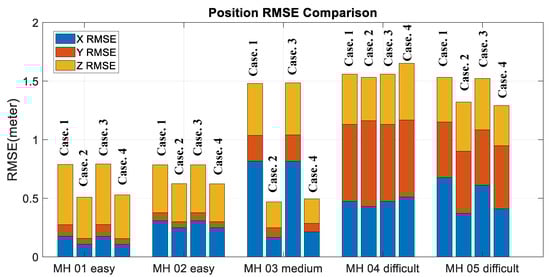 Moreover, to validate the contribution of the proposed algorithm for localization accuracy objectively, the loop closure for drift compensation in the following experiments is not considered. Based on the above four conditions, the corresponding accuracy analysis results are shown in Figure 19, Figure 20, Figure 21 and Figure 22. In Figure 19 and Figure 20, the error bars in each dataset series with respect to the above four different strategies are displayed from left to right.