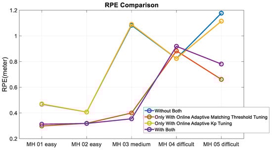 Take the MH_01_easy series as an example, and observe the positioning accuracy with matching thresholds 10, 15 and 20, respectively. As listed in Table 1, the absolute trajectory error (ATE) and relative pose error (RPE) [] are adopted as the benchmark to evaluate the accuracy.