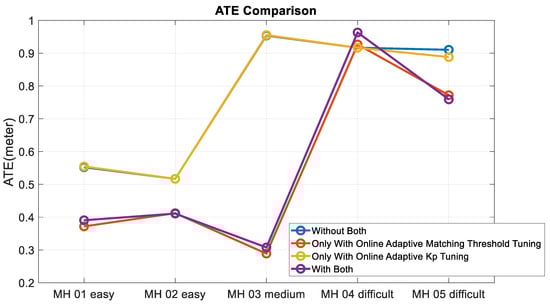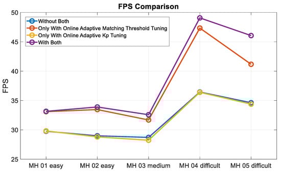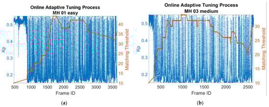 Figure 24 shows the automatic tuning process of matching threshold and parameter (take the MH_01_easy and MH_03_medium series, for example). Figure 24 shows the matching threshold is not always being adjusted at every frame, but only when the keyframe is established, which corresponds to the content described in Section 3.2. In contrast, the online adaptive tuning is performed at every moment, as long as the acceleration information is available.