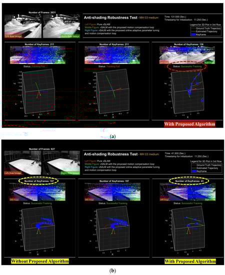 The results of the anti-shading robustness test with MH_03_medium series: (a) Anti-shading robustness examination (Supplementary File Vedio S1); (b) Key frame examination (X-Y-Z axis Unit: meter).