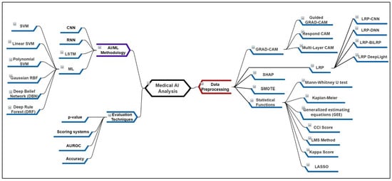 Figure 1 presents the mindmap diagram for the literature survey analysis. The explanation type ante-hoc is for open/human understandable models and post hoc for black boxes and Deep Neural Networks (DNN). One of the commonly occurring infections within patients is bloodstream infection (BSI), which can be identified by the presence of bacterial or fungal microorganisms within the blood samples []. It is also popularly known as sepsis/septic shock and has severe symptoms. The most common symptoms include fever, increase in heart rate, high blood pressure, chills, and gastrointestinal issues. In the previous studies, the BSI was studied in detail with vital signs and laboratory variables with ICU admission data. The preprocessing is mostly done to recover the missing data in the BSI and Non-BSI cases, which is later evaluated using the machine learning model. The BSI once detected then later can be cured using medicine treatment.