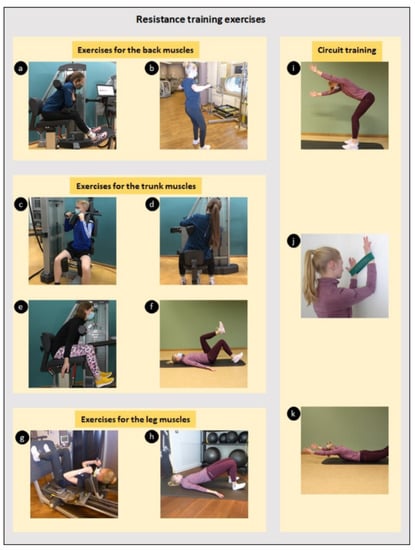 Exercises of the resistance training programme: (a) back extension, (b) wide rowing, (c) trunk rotation, (d) lateral flexion of the trunk, (e) trunk flexion, (f) dead bugs, (g) leg press, (h) glute bridge, (i) arm wiggles, (j) wall walk and (k) superman.